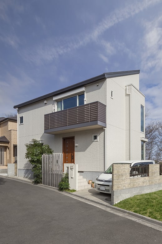 道路に面した西側は窓を少なくし、バルコニーをつけて視線をカット