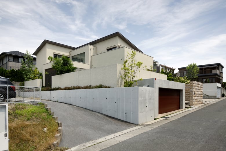 高低差の敷地を活かした、ビルトインガレージの上に住まいが載るかたちの2階建て。高さ制限や斜線制限が厳しい中、吹き抜けや折り上げ天井、柱・梁の現わし仕上げなどを駆使して、心地よく光と風が抜ける、緑と眺望を楽しめる住まいが実現しました。アプローチ階段から室内へ入ると広々とした玄関ホール。その先には大きな吹き抜けで家全体の家族の気配が感じられるリビングと、ダイニングが続きます。LDが取り巻くように配された広々としたデッキには、気持ちの良い植栽と、芝生の庭が続きます。内外装とも素材の質感を重視。時を経てより美しくなる、無垢の床材や石、珪藻土などの自然素材を厳選して使用。お客様こだわりの露天風呂である美濃焼の「つぼ風呂」は格子や植栽で視線を遮りながらも気持ち良く風が抜ける快適なスペースに。