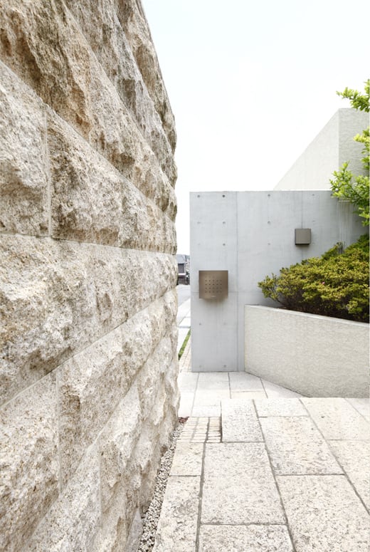 玄関へのアプローチ。自然石の表情を生かした花崗岩の外壁が印象的
