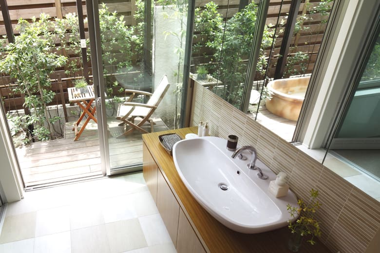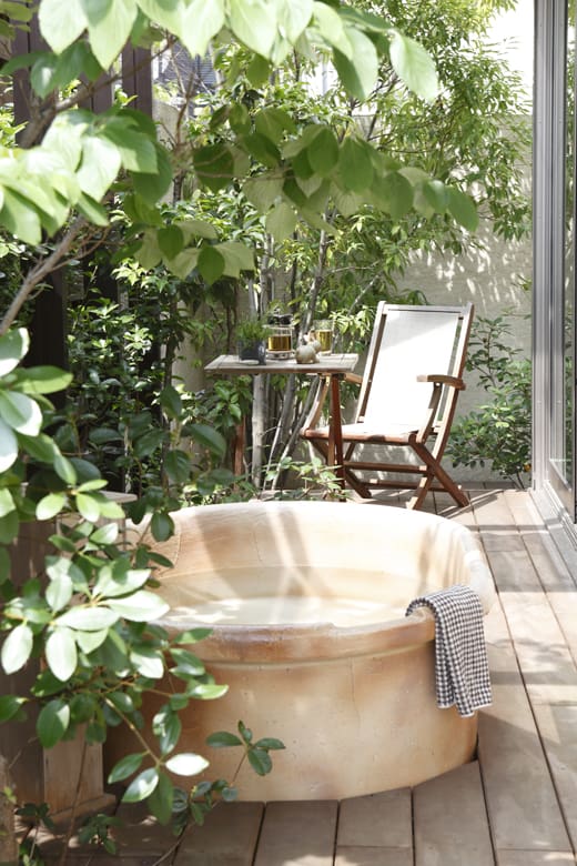 浴室のデッキに据えられた美濃焼のつぼ風呂
