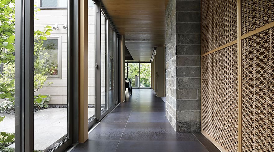 高級感あふれる石壁とタイル床が多用された室内に、「団らんのリビング」の組子障子が温もりを添える。