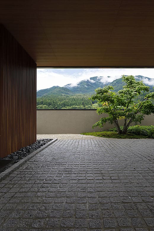 車寄せの正面で四季折々の移ろいを見せてくれるイロハモミジ、その先には高台ならではの素晴らしい眺望が広がっている。