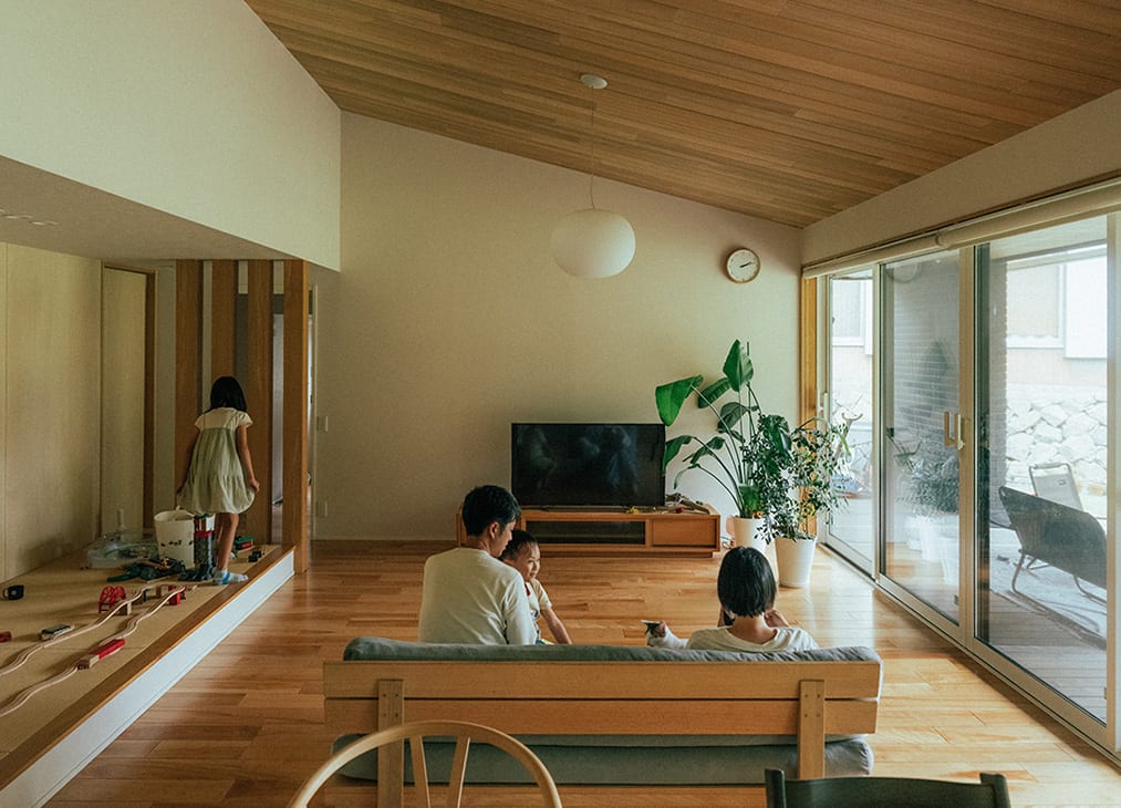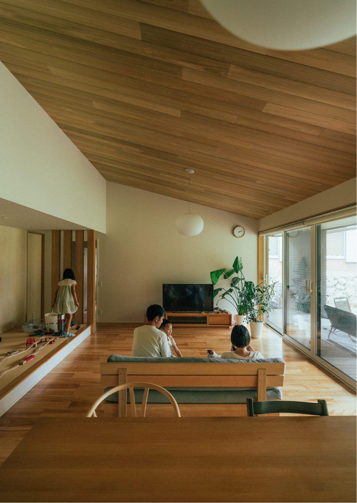 のびやかな空間を活かすため、梁や凹凸をできるだけ見せない設計にしました。平屋ならではの横への広がりに、縦の開放感を加えることで、家全体がより伸びやかに感じられるよう計画しています。