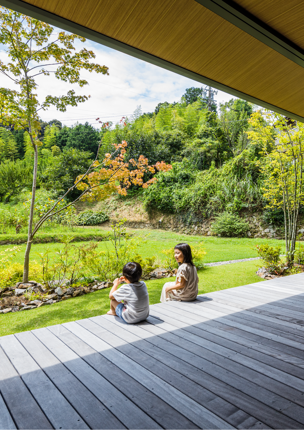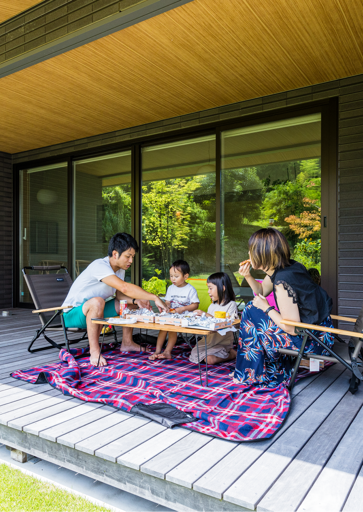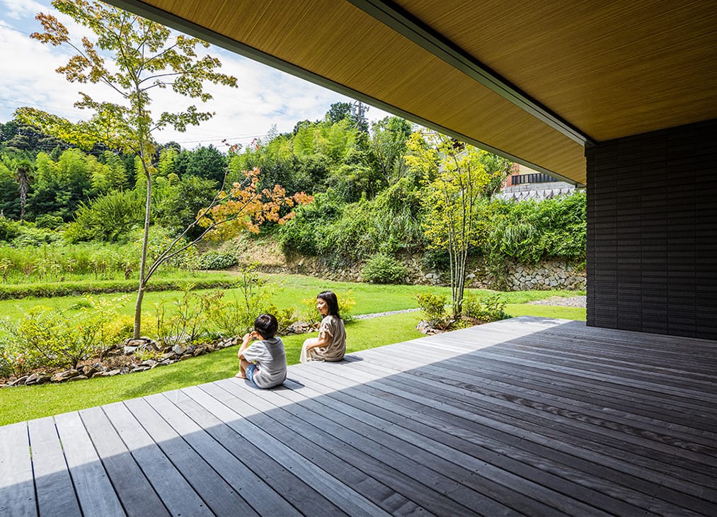 室内の床と高さを揃え、視覚的にも一体感が出るようにしています。 また、深い軒を設けることで、日差しをやわらかく調整し、夏でも涼しく過ごせる場所にしました。