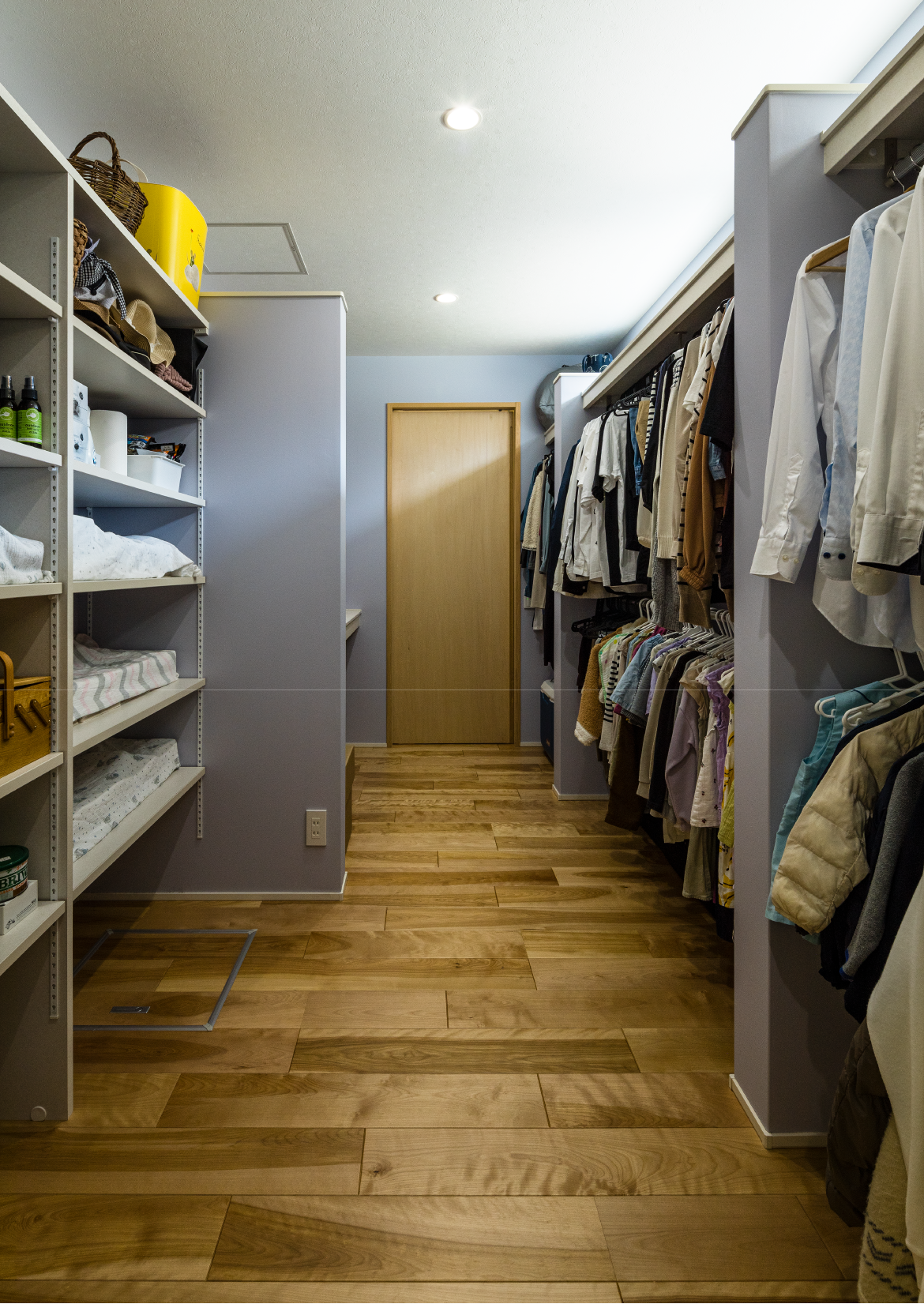 家の中心近くにあるので、どこからでも使いやすく、助かってます。 帰宅後すぐに着替えられて、そのまま手洗いやお風呂に行ける動線も便利ですね。家族みんなが自然と使う場所になっています。