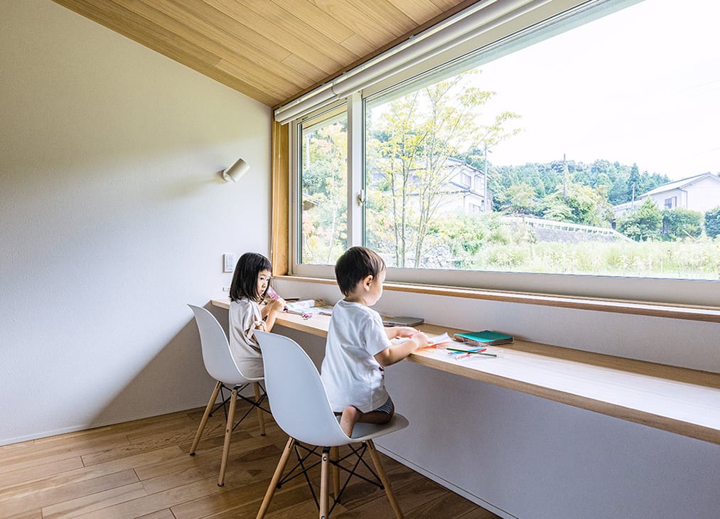 LDK全体が勾配天井になっていて、実際よりもさらに広く感じます。南側の大きな開口からはたっぷり自然光が入って心地いいですし、子供たちがどこにいても目が届いて安心です。