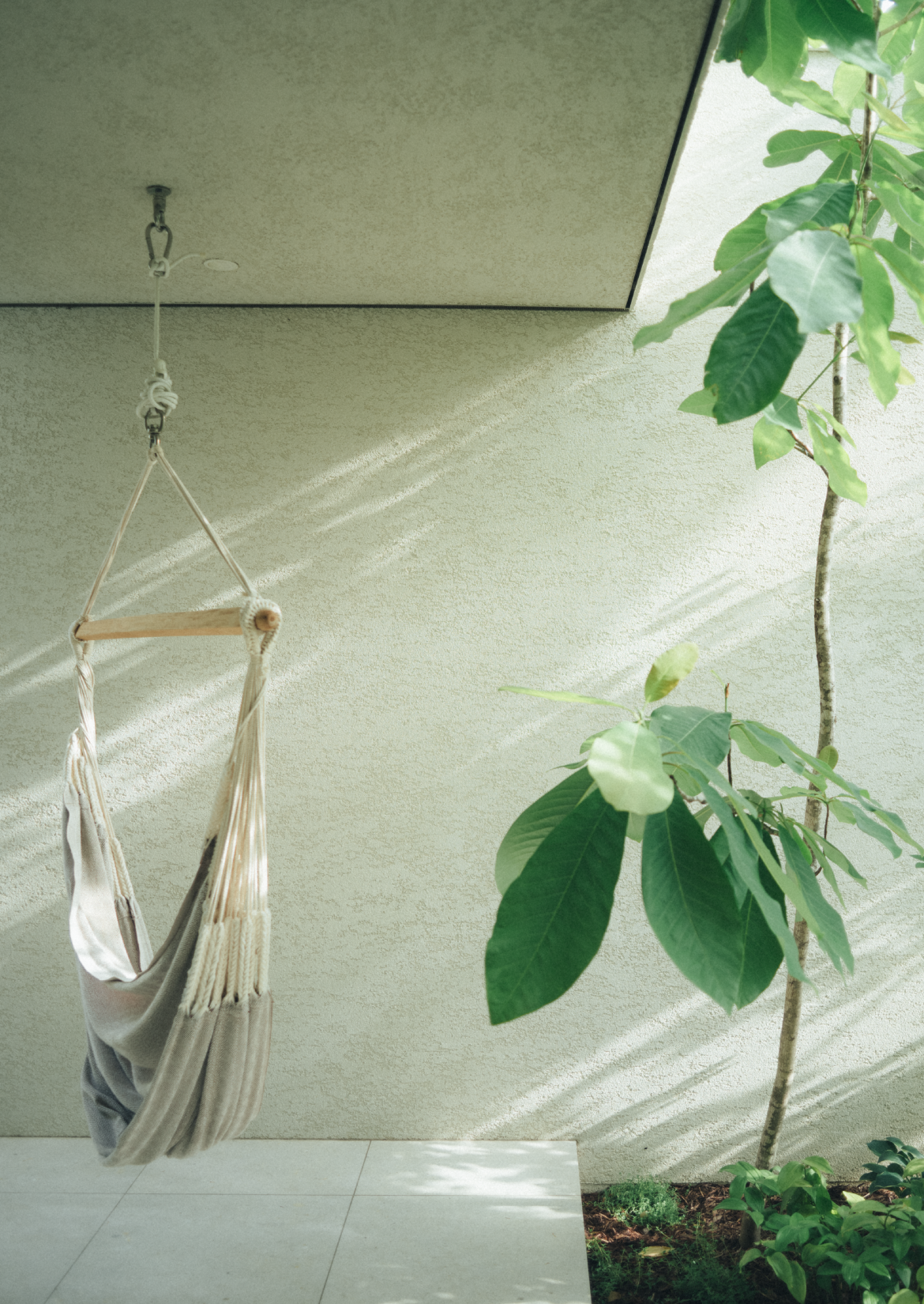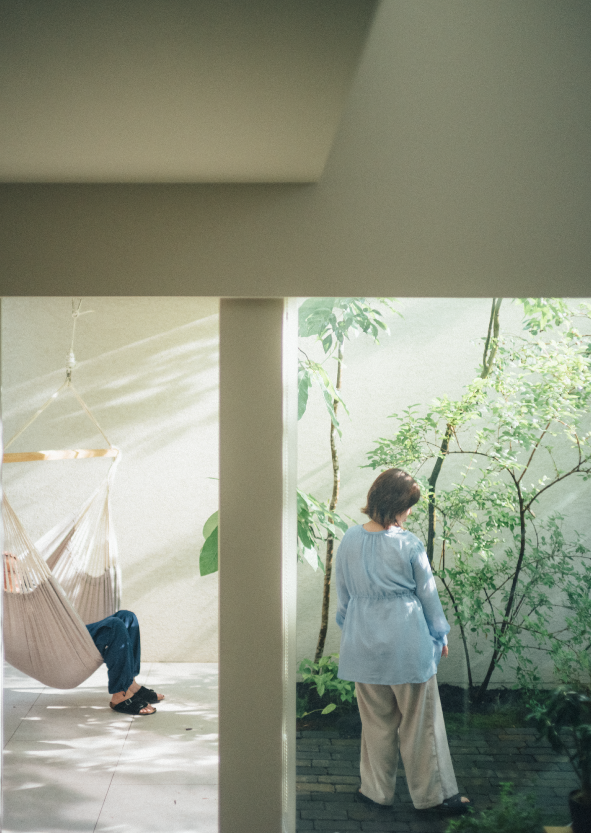 家の中にいても、ふと視線を上げると空や緑が見えるのが気持ちいいですね。閉じこもっている感じがなく、どこにいても外の開放的な空気を感じます。中庭のハンモックは、特等席です。