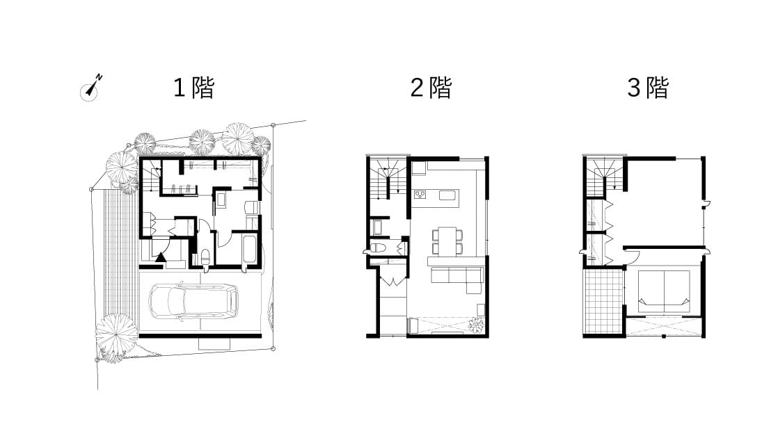 三層を明確に区分し、動線を整理しました。上下移動の負担を減らしながら、限られた敷地を最大限にいかす構成としています。