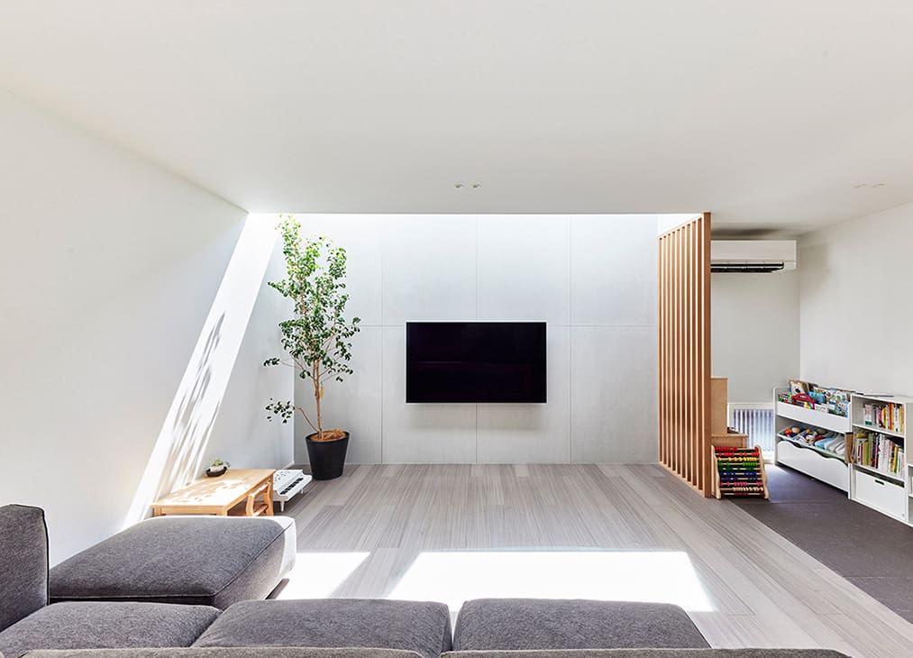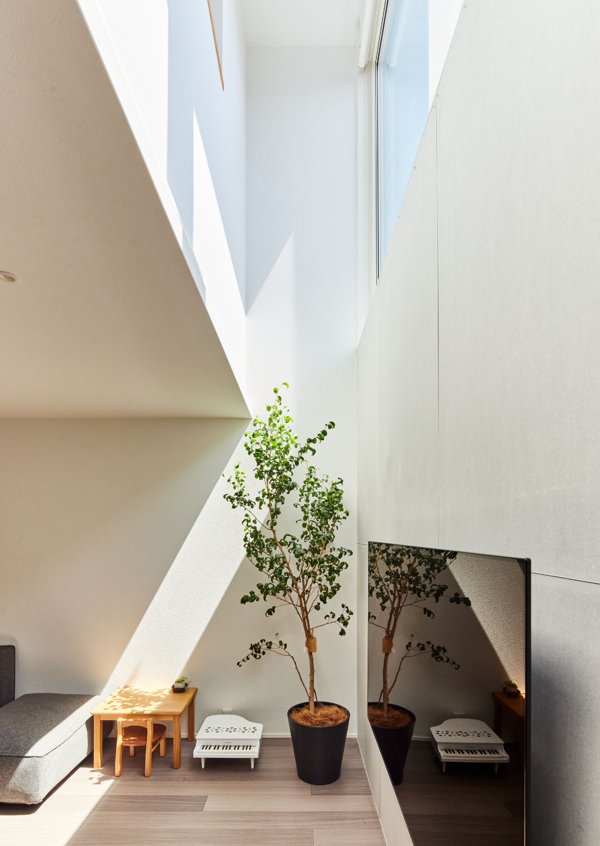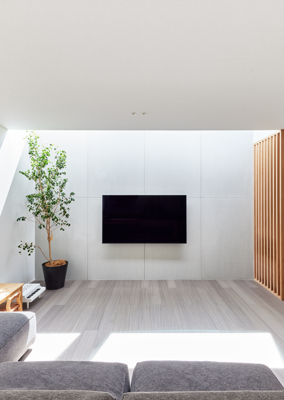 敷地条件を踏まえ、縦方向に光を取り込む計画としました。限られた幅でも効果的に採光できるよう、吹き抜けの位置と窓配置を綿密に検討しています。
