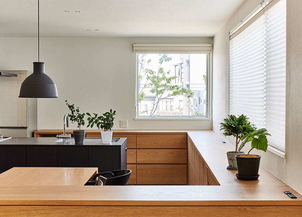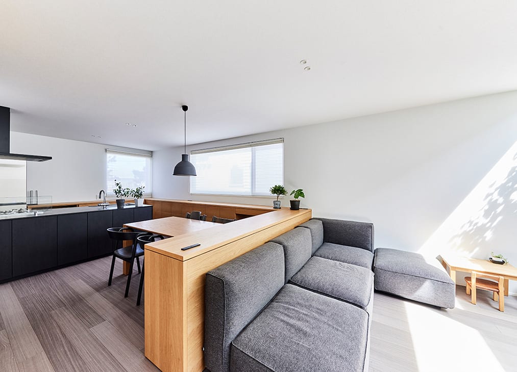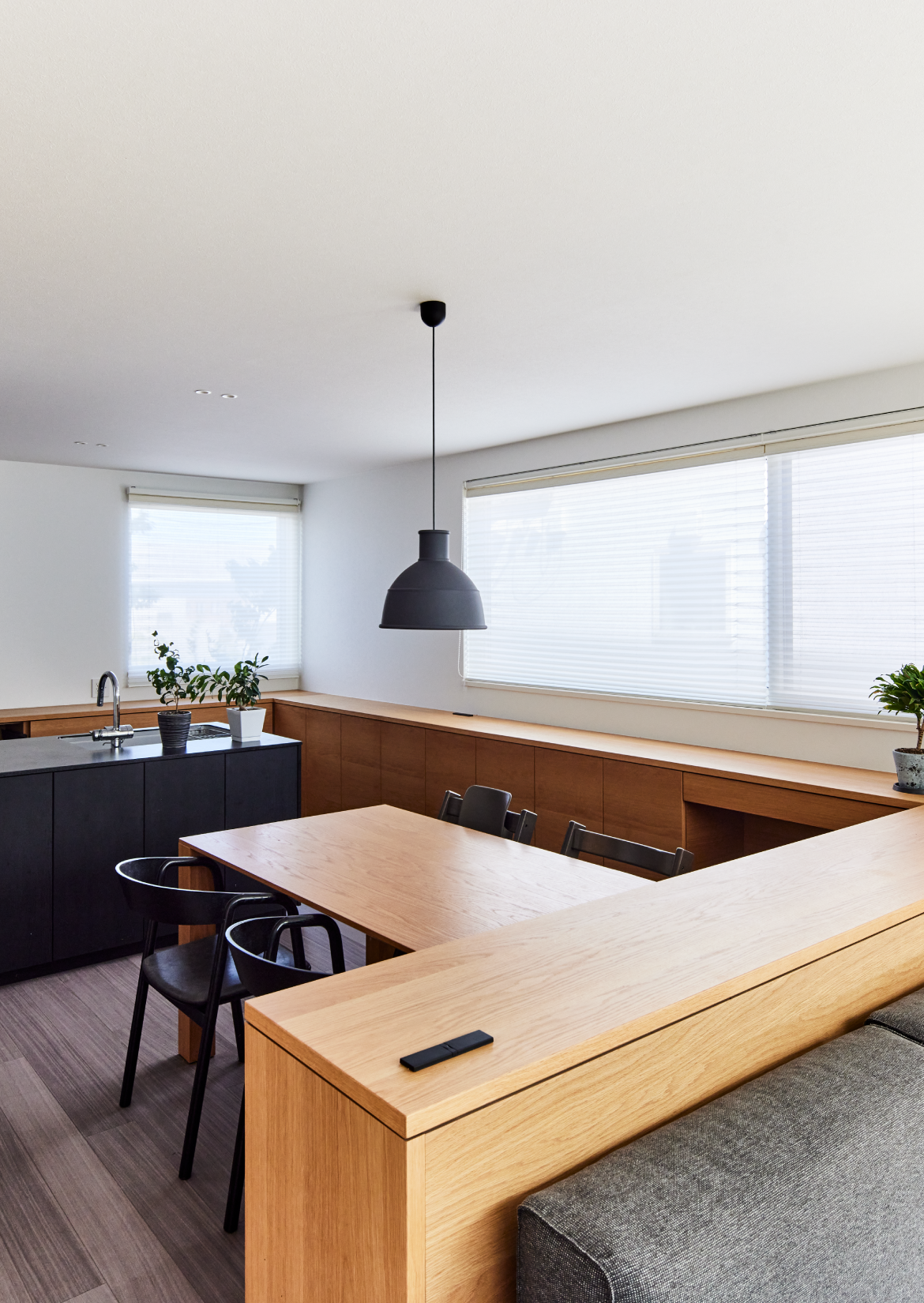 コの字型の造作家具を設置し、壁を増やさず空間を整理しました。また、家具や扉などインテリアの材質を木でそろえることで、統一感を生んでいます。