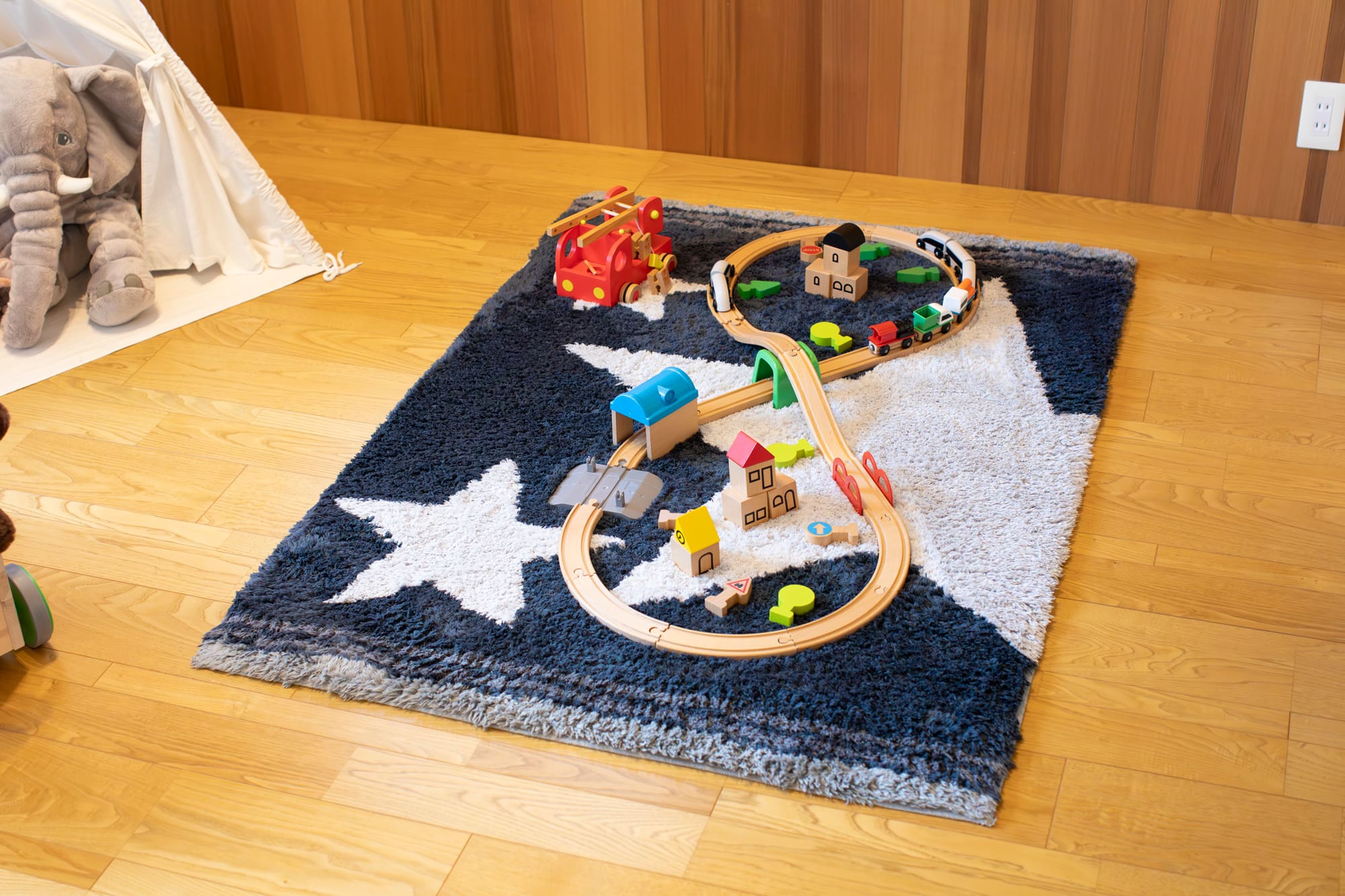 物を置くという動作ができるようになる2歳くらいから、子どもに片づけの感覚を少しずつ育てていくことができます。最初は、ラグの上やタオルなどを使って「このエリアに収まっていればいいよ」と、遊びの延長でそこにおもちゃを集めるように促してみましょう。