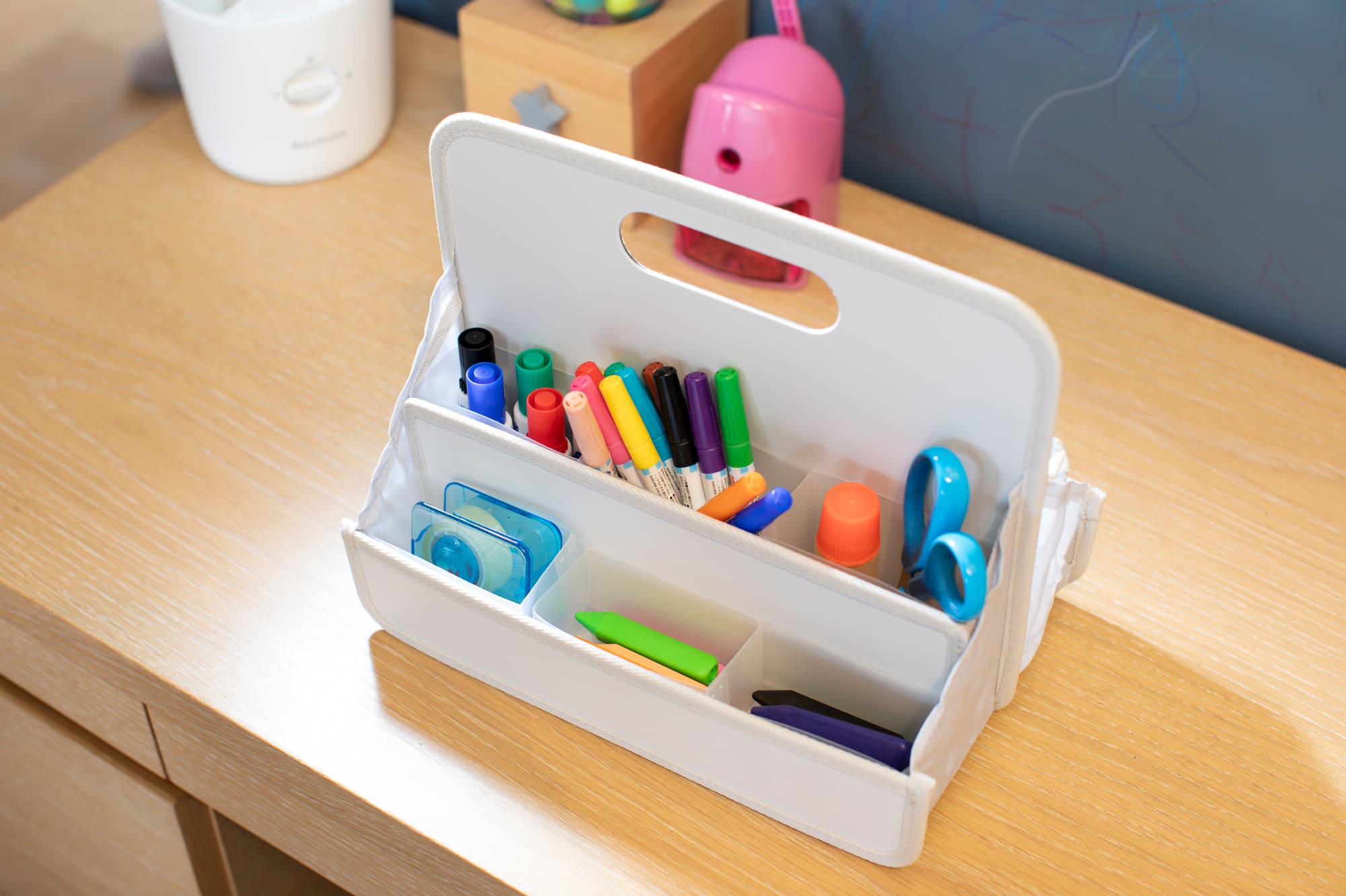 お絵描き大好きな子は、使いたい画材を選びながら描くことが多いもの。でも、使いたいペンがすぐに見つからなかったり、取り出しにくかったりすると、せっかくの創作意欲が止まってしまうこともあります。出し入れしやすいこんなボックスなら、ペンや文房具がひと目で見え、取りやすく、片づける時もラクなんです。