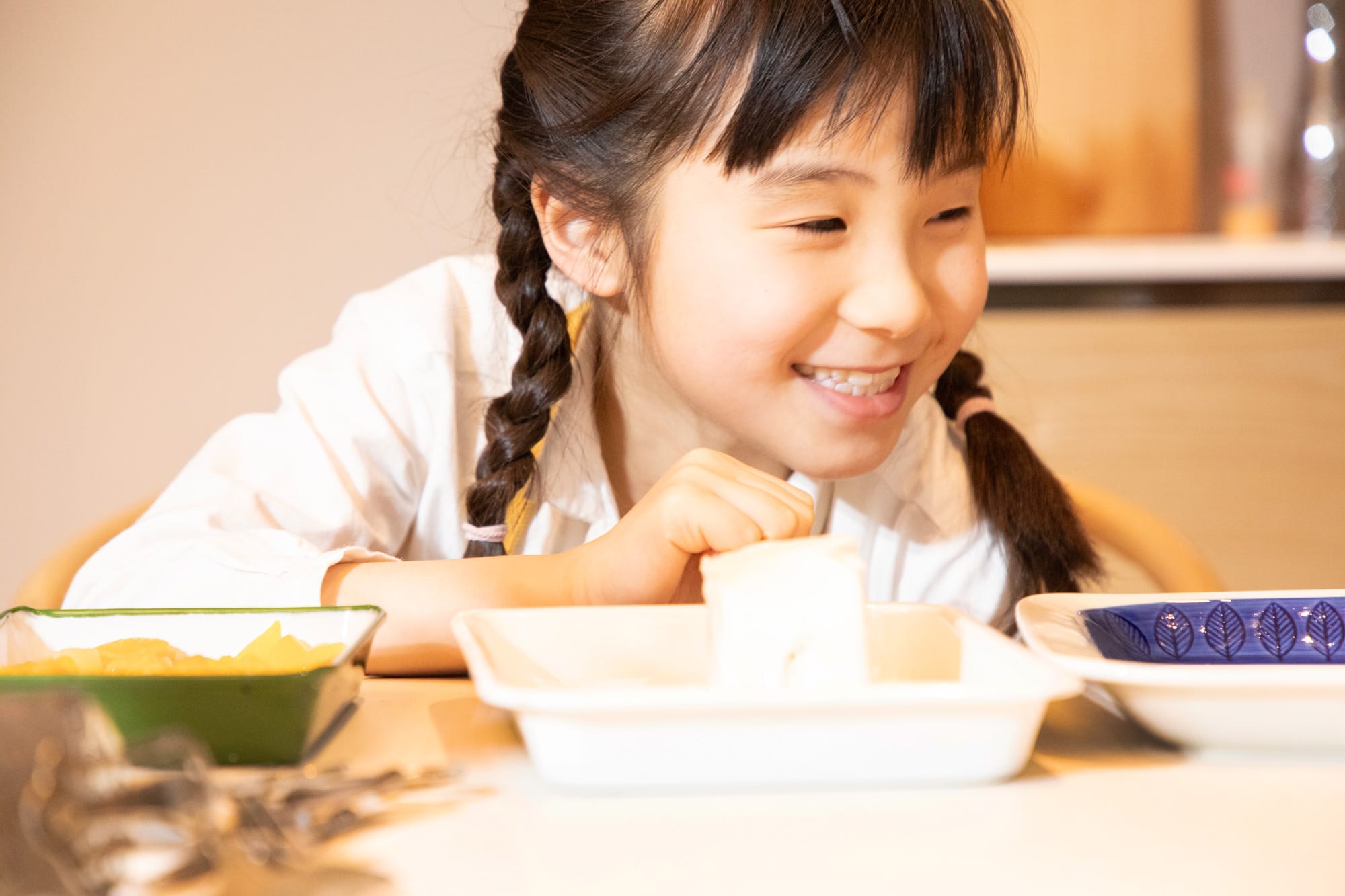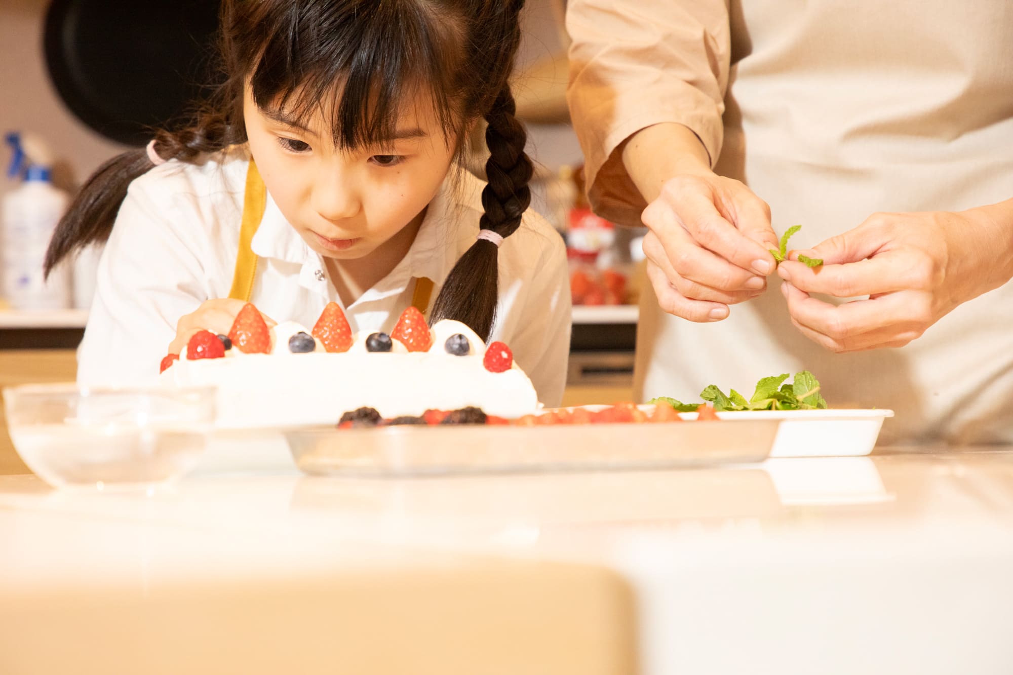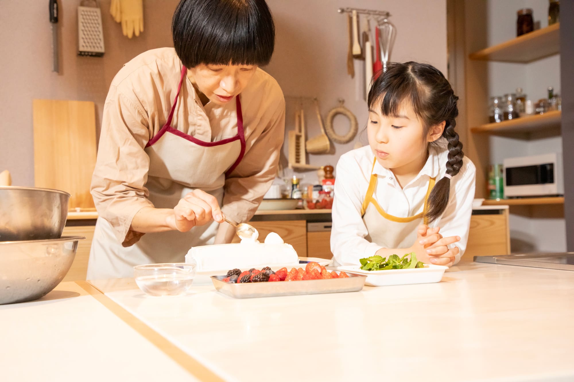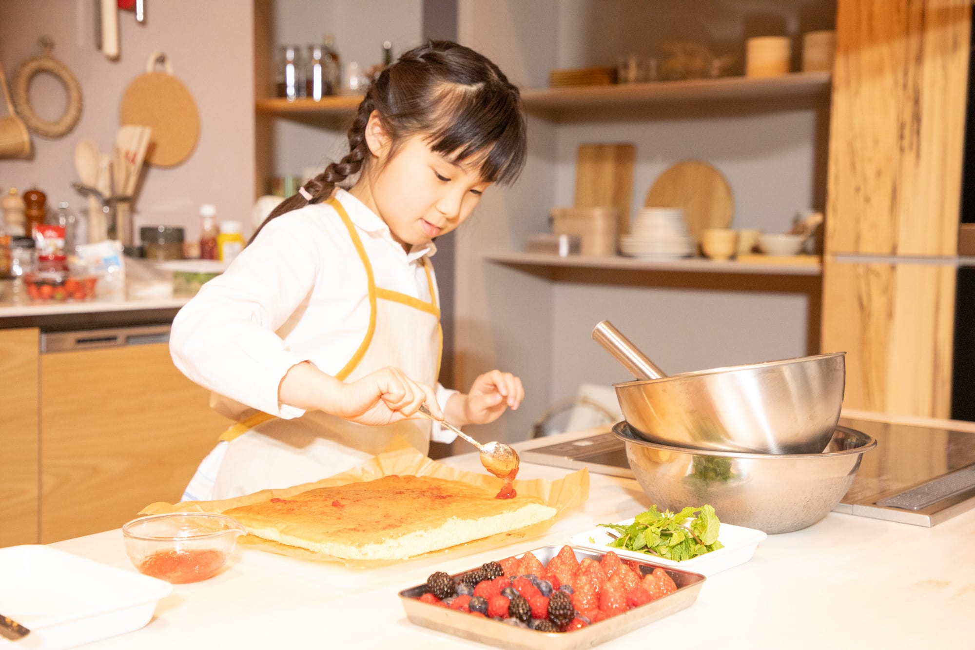 やり方を"ゆっくりやって見せること"でお子さんの「できる!」「やってみたい」につながります。時に、子どもサイズの道具を用意すると、作業がしやすくなり、さらに「できた!」という自信も育まれます。たとえケーキの形が綺麗じゃなくても、作った"プロセス”こそがプライスレス!