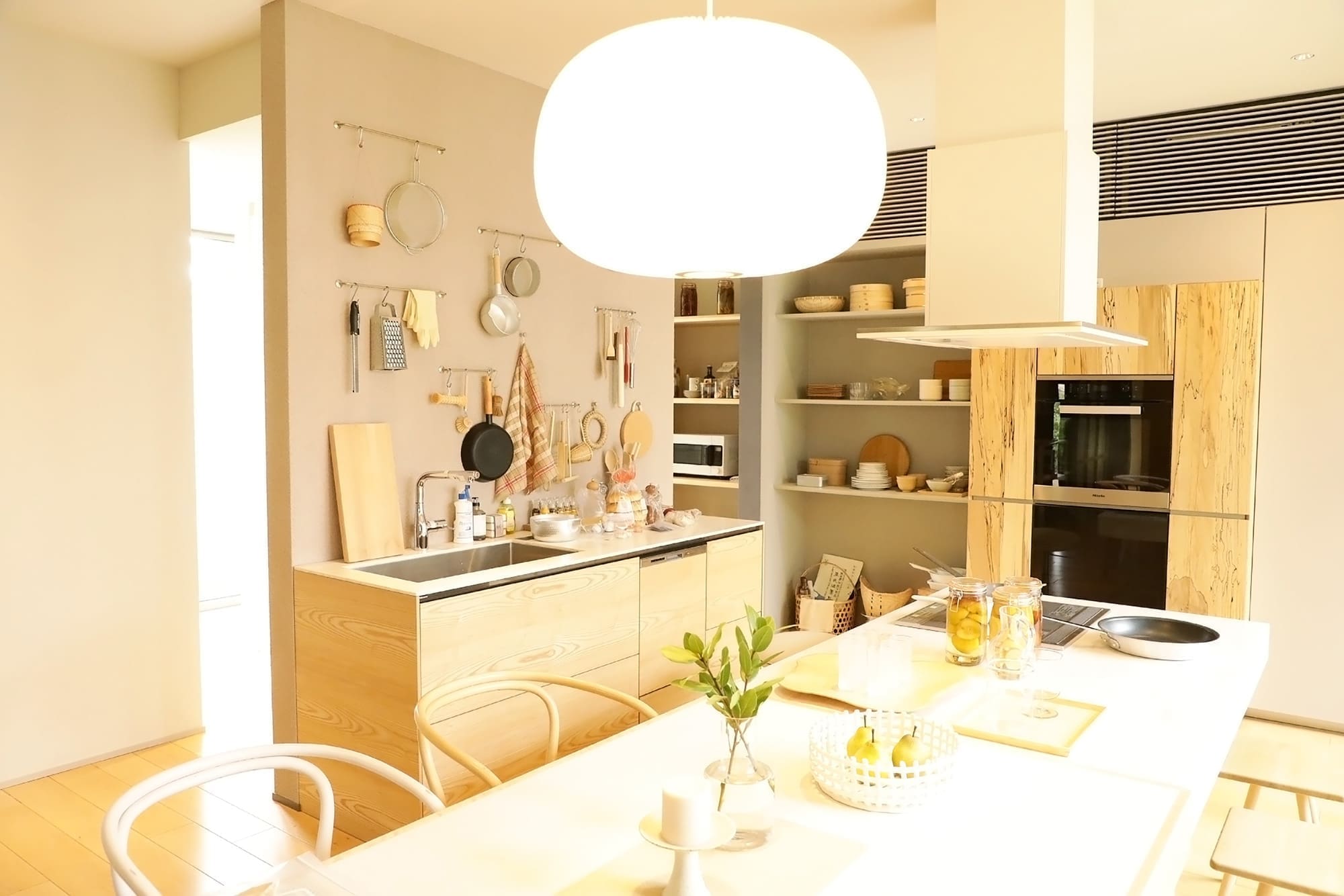 食事を通した家族団らんの時間を大切にできるように作られた「内藤さんち。」のキッチン。調理台と食卓が同じ高さでひと続きになっているので、空間に区切りなく、調理をする人も座ってリラックスしながら同じ目線で食卓にいる人と会話ができます。みんなで作りながら同時に食べるようなBBQやホームパーティにも最適なキッチンです。