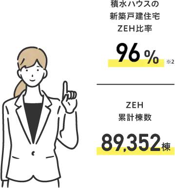 昨今、世界規模で脱炭素社会への取り組みが進められるなか、ZEHは地球環境に対して負荷の少ない住宅としても注目を集めています。国内住宅メーカーのなかでもいち早くZEHを手掛けてきた積水ハウスは、 開放的な空間とZEHを両立するオリジナルブランド「グリーンファースト ゼロ」で、新築戸建住宅のZEH比率96%※2を達成し、累計販売刀子は89,352棟となっています。
