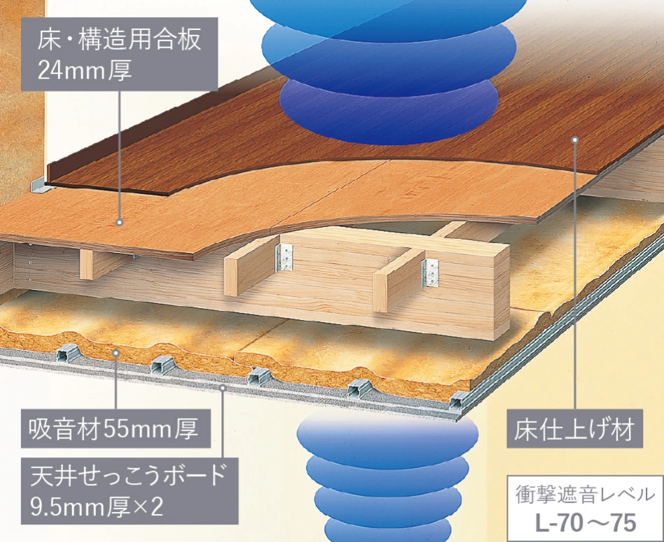 標準仕様では、天井裏に吸音材を敷いて石膏ボードを2重貼りにした「木根太床」をご用意。遮音性能を高めたい場合はALC仕様を選べます。