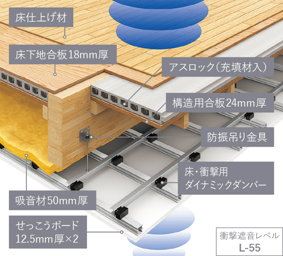 ALC仕様の他にも、さらに遮音性を高めるオプション仕様として、アスロック(充填材入り)という充填剤と遮音DD(ダイナミックダンパー)天井で構成した「遮音床」のご用意があります。