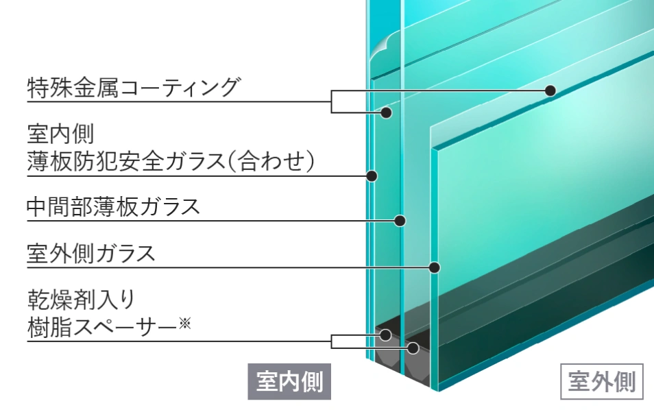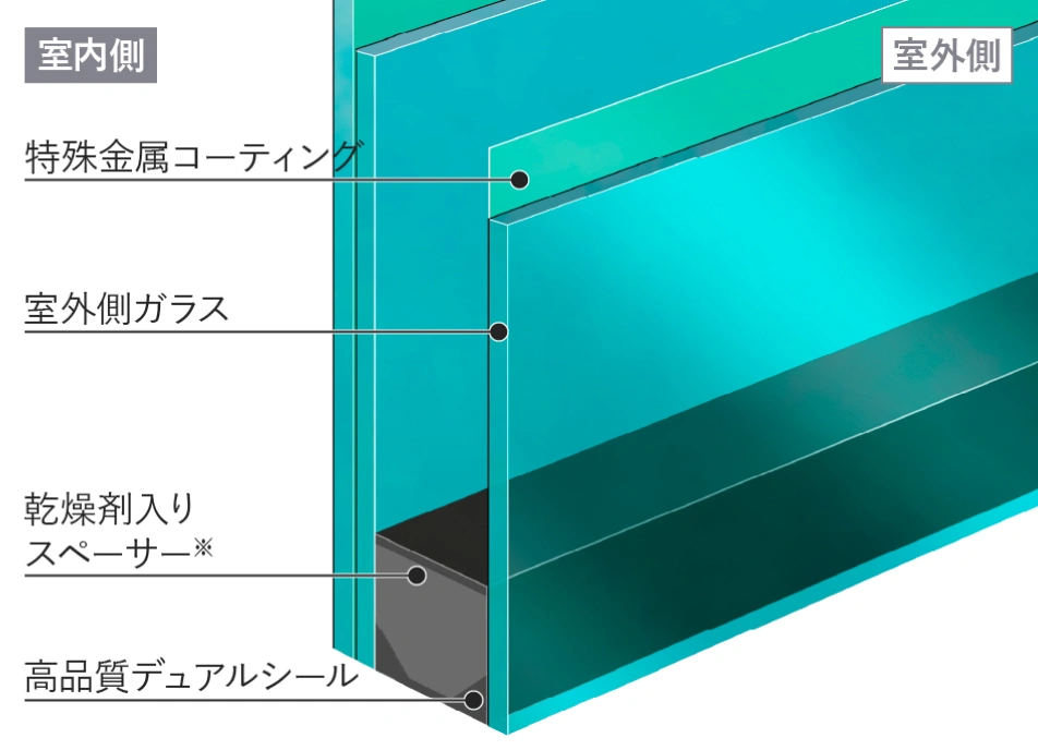 積水ハウスが採用している遮熱断熱複層ガラスは、室外側ガラス内部にコーティングされた特殊金属膜が、夏の太陽の熱線・紫外線をカットし、冷房の効果を高めます。