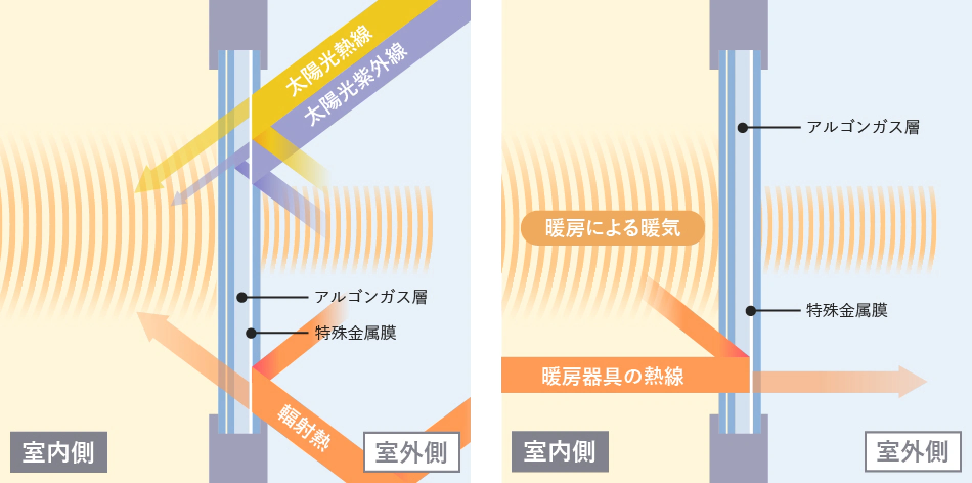 また、冬は室内からの暖房による熱線(遠赤外線)を反射。ガラス内に空気よりも熱伝導率が低いアルゴンガスを注入し、より断熱性を高めています。