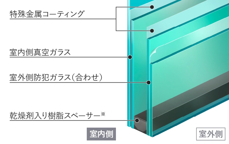 真空ガラスと高断熱ガラスを組み合わせた高性能複層ガラス。熱の伝導や対流が起こらない真空の特性を活かし、当社複層ガラスに比べ断熱性能は1.7倍になります。ガラス内にはアルゴンガスを注入しています。