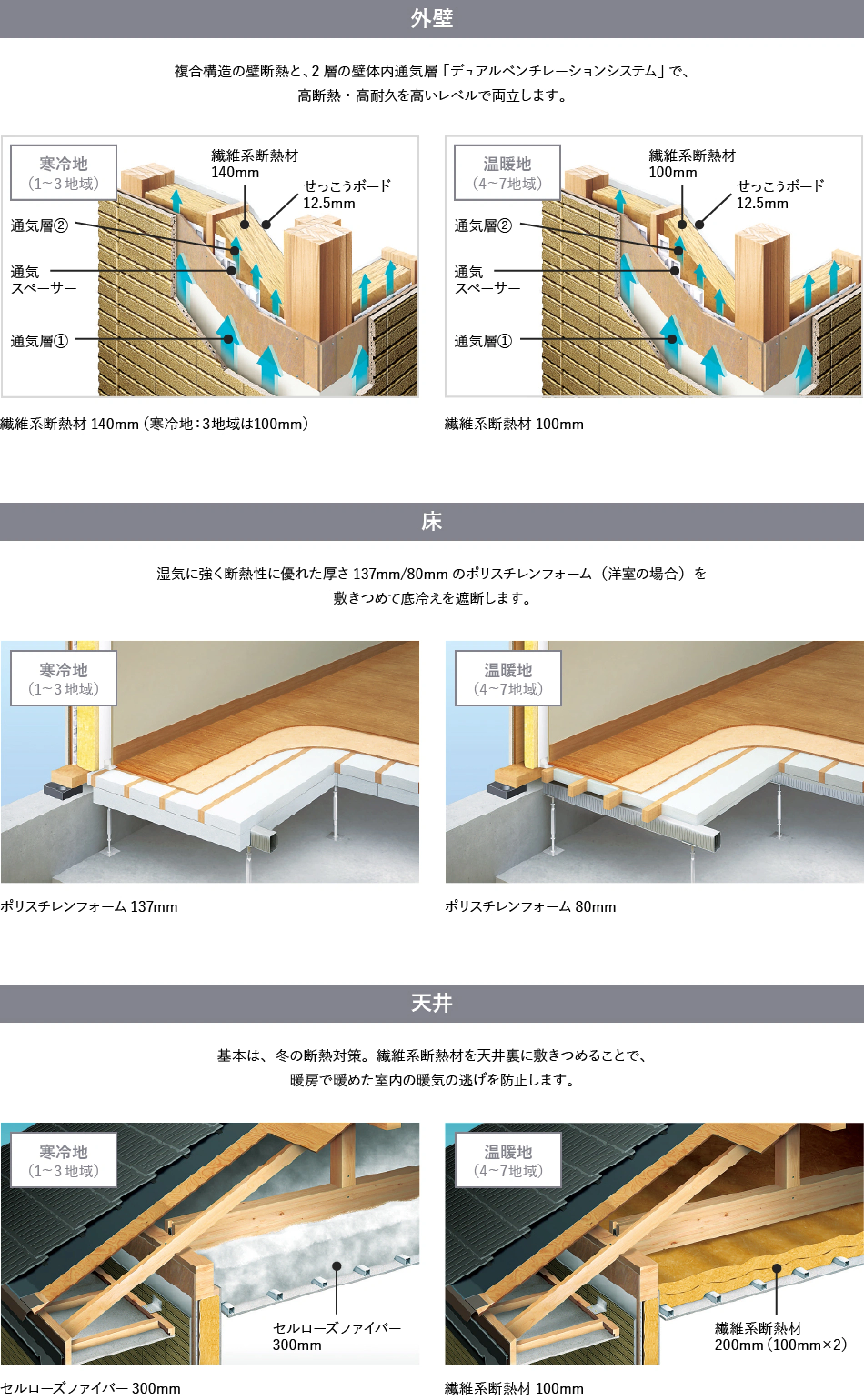 たとえば外壁ならば寒冷地(1〜3地域)と温暖地(4〜7地域)で使用する繊維系断熱材の厚みが、床では敷き詰めるポリスチレンフォームの厚みがそれぞれ異なります。