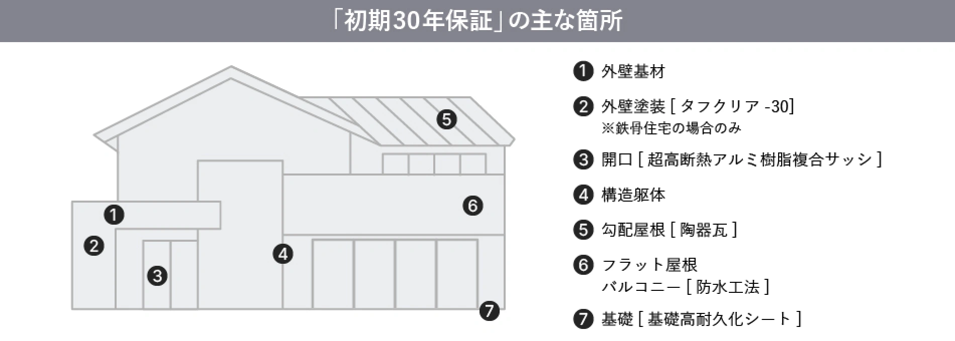 初期30年保証の主な個所は「構造に関わる部分」と「雨水の浸入を防止する部分」となり、10年20年点検時に会社が必要と判断した補修工事(無償工事)を行うことで保証が継続されます。