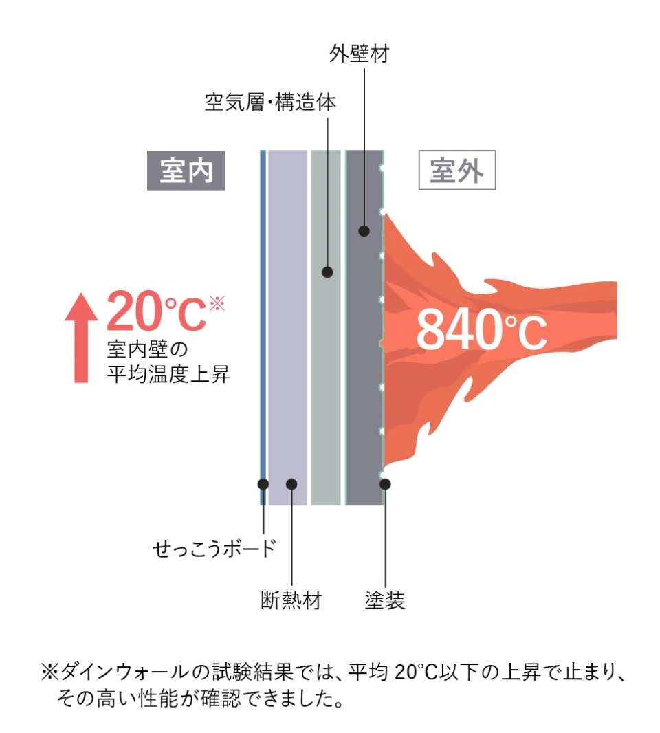 さらに、シャーウッドの外壁材はどの仕様の外壁でも、防火サイディング、空気層、構造用合板などの構造による複合壁体構造で、すべての外壁で防火構造認定を受けています。隣家の火災により壁が840℃の熱にさらされた場合でも、外壁裏面温度は100℃以下。木材の着火温度である260℃を上回ることはありません。
