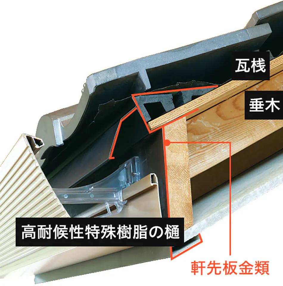 木造住宅「シャーウッド」の場合、軒樋(のきどい)には、独自開発の形状を採用。表面に高耐候性特殊樹脂を用いて、経年劣化による色褪せを低減しています。