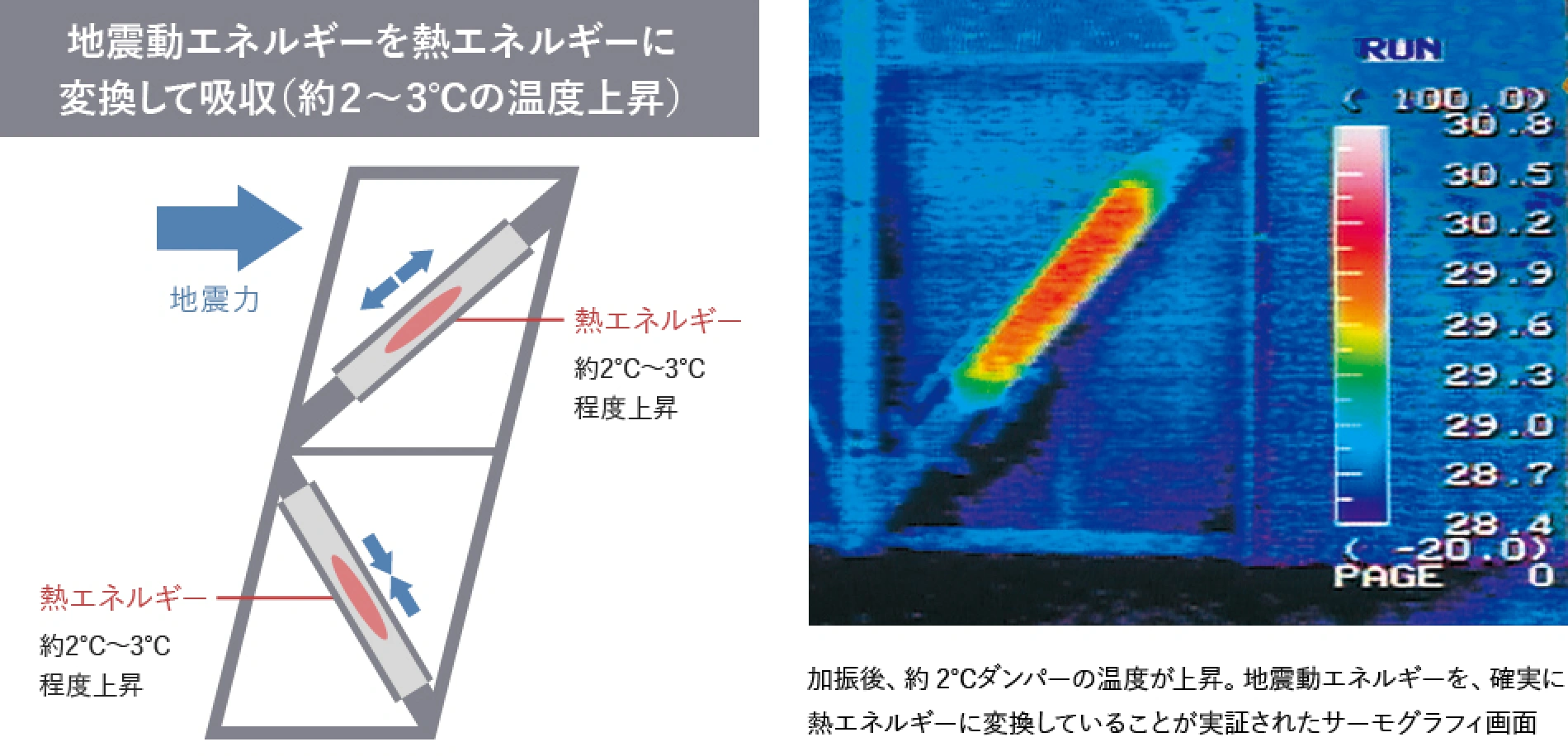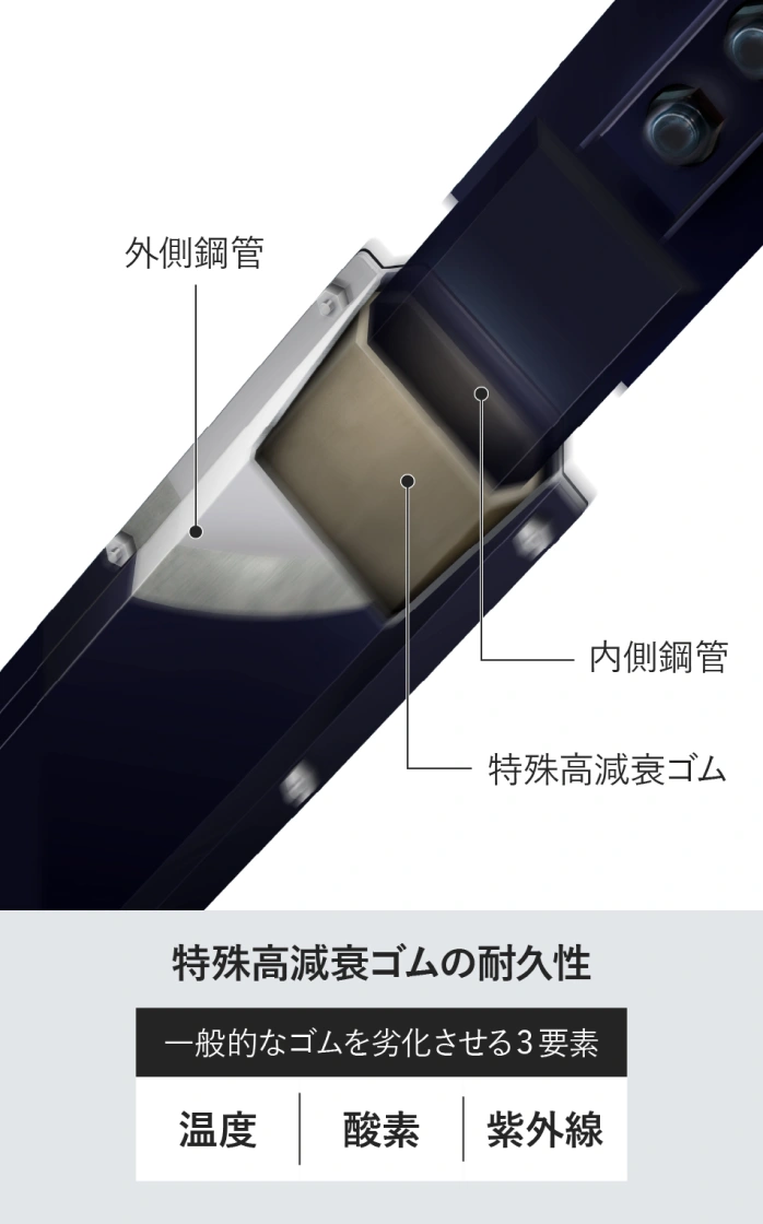 特殊高減衰ゴム「シーカス60」は、熱・酸素などに対する劣化防止剤が独自の配合で加えられています。また、このゴムは外側鋼管と内側鋼管の間に密閉されているため、劣化要素の影響をほとんど受けることなく、長期にわたり安定した性能が得られます。試験では、耐用年数100年相当の耐久性を確認しています。