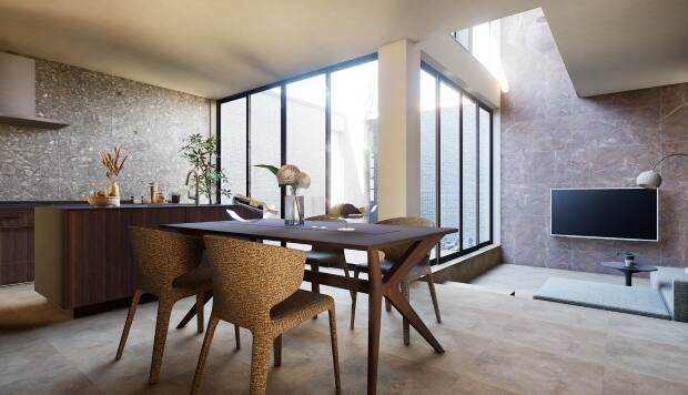 深い軒のあるテラスと4m×6mのコーナークリアビューサッシで繋がる39帖のLDK。