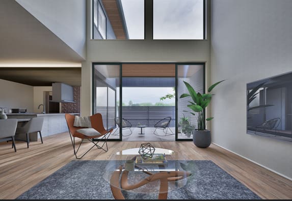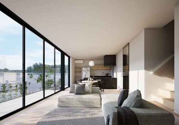 フラット屋根のシャープなシルエットと水平ラインを活かしたモダンデザインの鉄骨住宅の展示場です。