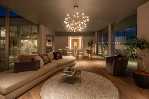 グレイッシュなモダンリビングでシックなインテリアの親世帯リビング。