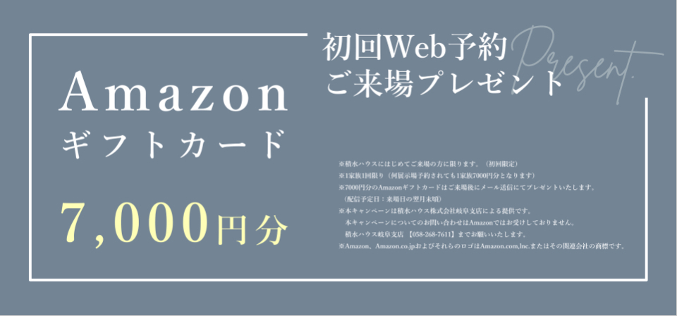 積水ハウスがはじめてのお客様に7,000円分のAmazonギフトカードをプレゼントいたします。ぜひWEB予約にてご来場くださいませ。