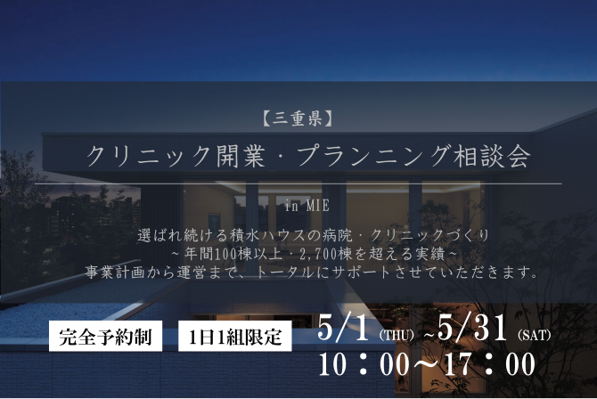 【三重県】クリニック開業・プランニング相談会 医療事業開業セミナー 三重県四日市市城西町15番26号積水ハウス株式会社 三重支店 本店 2025/11/20(木) ~ 2026/07/31(金) ご予約・お申し込み