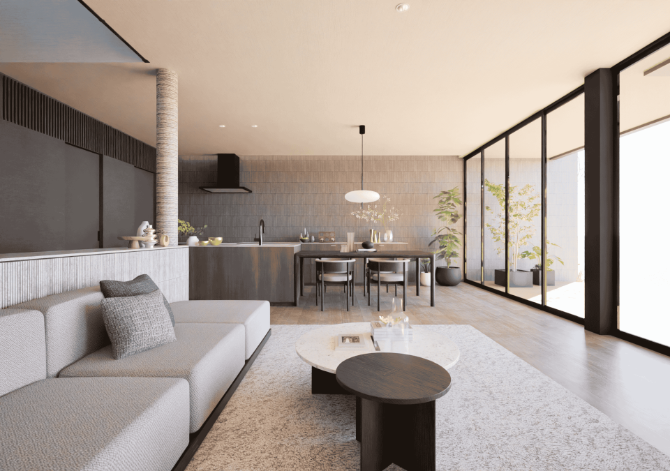 アースカラーを基調に「素材の豊かさや暖かさ」が息づく、時間に左右されないタイムレスな空間美。