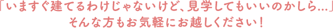 総合住宅展示場は広大な敷地のところも多く、いくつかの会場に分かれていることも。 歩きやすく、脱ぎ履きしやすい靴・身軽な服装で行きましょう。