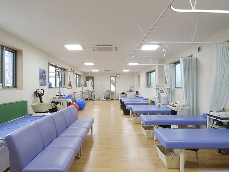 ドクターのご要望を動線計画や空間プランニングに反映して、1階にクリニックとリハビリ室、2階に通所リハビリセンター、3階にスタッフのスペースを配置。免荷装置付き歩行訓練機やウォーターベッド型マッサージ機などの最新機器を導入し、理学療法士や作業療法士が利用者一人ひとりの状態や年齢に合わせて適切なリハビリテーションを提供。心身の機能維持・回復をはかります。