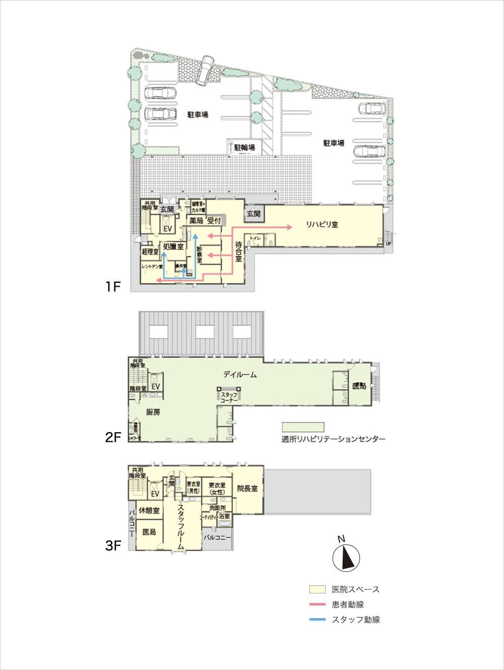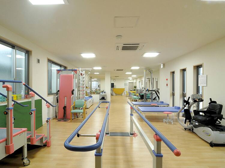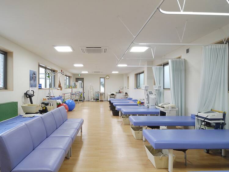 1階はクリニックと外来用のリハビリ室。東西に長いリハビリ室には、ベッドやリハビリ機器が効率的に配置されています。