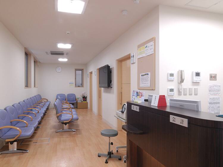 待合室を診療スペースとリハビリ室の間に配置。診察の患者さんとリハビリの利用者が交差することなく目的の部屋に移動できます。