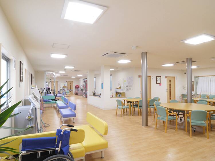 2階の通所リハビリセンター(デイケア)では、理学療法士が利用者に合わせた適切なリハビリテーションを提供。中央のスタッフコーナーから広い部屋全体に目が届くようになっています。