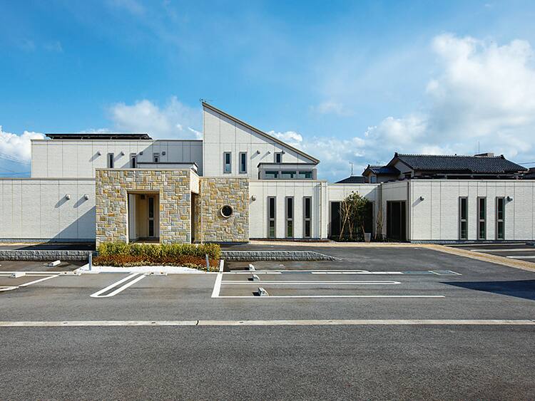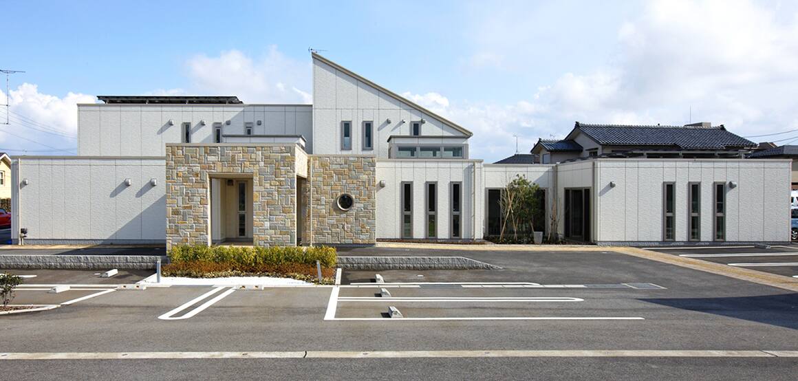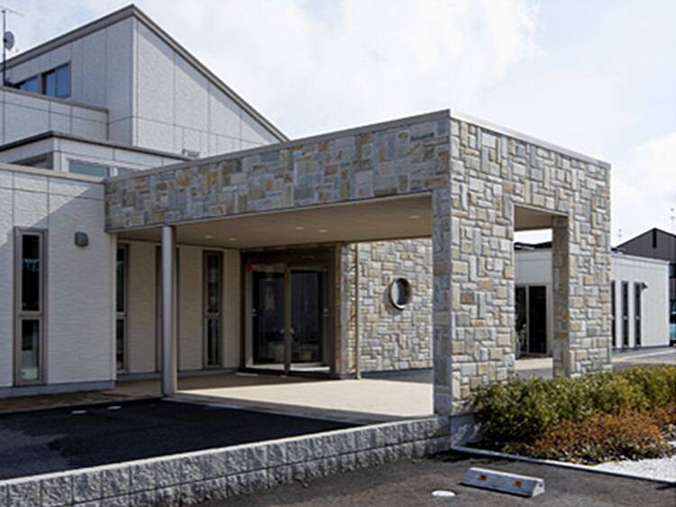 雨の日にも患者さんが濡れないように設置したキャノピーは、石張りをアクセントとした外壁とし、モダンな印象の中に上質感をもたらしています。また、駐車場には積雪を感知すると作動する融雪装置を設けているので、雪の日も安心です。