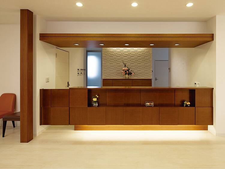クリニックの顔となる受付は、スタイリッシュでホテルのような空間に。間接照明やダウンライトのやさしい光が、質感にこだわったカウンターや壁面に豊かな表情を持たせ、上質な癒やしの空間を演出しています。
