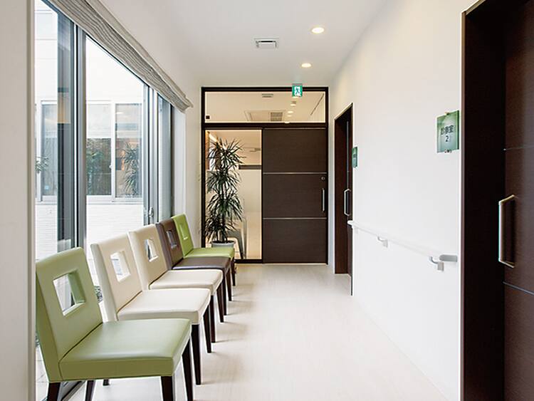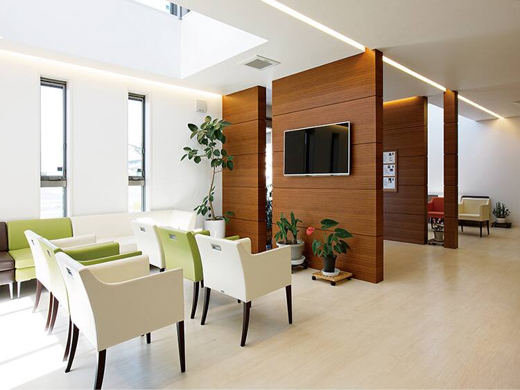 外光が射し、明るく気持ちよく過ごせる内科の中待合。通路を広く設けたため、椅子に座っている人がいても車椅子が楽に通れます。