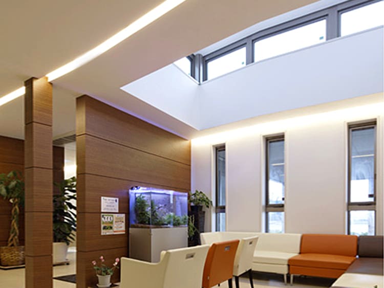 両待合室の上部にはハイサイドライトを設置。四方から自然光が降り注ぎ、明るく開放感があるので、待ち時間もリラックスして過ごせます。