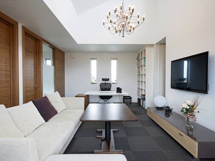 フラット屋根に片流れ屋根を組み合わせ、モダンなデザインに仕上げました。外壁にはカビや汚れを防ぐハイブリッド光触媒塗装を施した外壁材を採用したので、清潔感のある白い壁を美しいままに保てます。