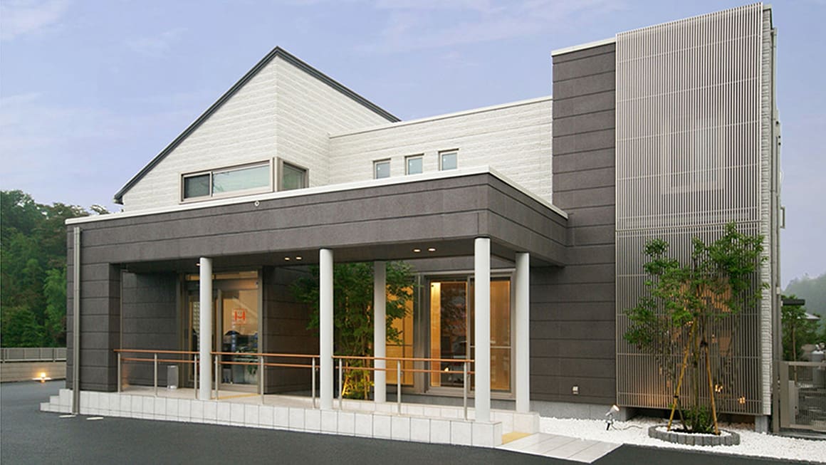 片屋根+フラットでモダンな外観に、車椅子でも利用できるピロティ部を組み合わせ、歯科医院としての存在感を表現しています。