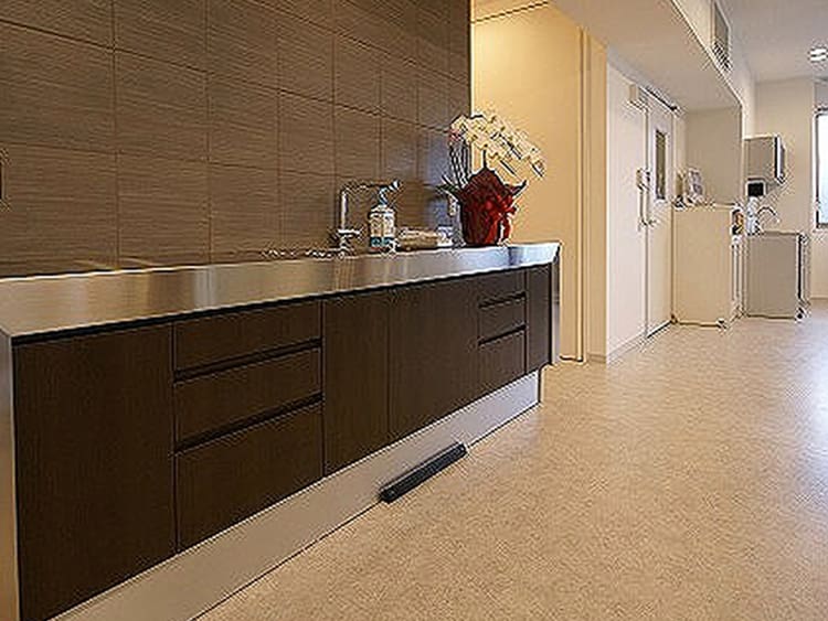 患者様の目に触れる診察室中央に設置された手洗いカウンターは”見せるデザイン”を意識して特注で製作しました。