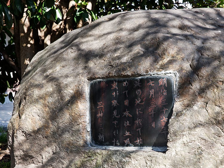 旧医院の庭に建てられた石碑。「明治三十七年七月三十日 此の地に於いて始めて日本住血吸虫が発見された 三神三郎」と、地方病根絶のきっかけとなった発見について刻まれています。