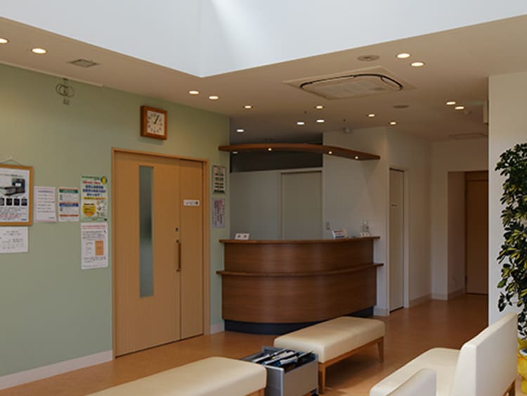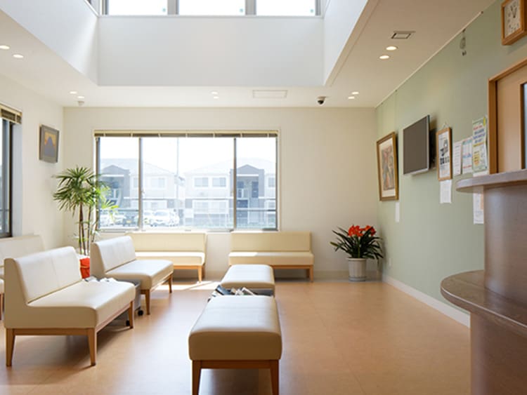 待合はナチュラルテイストのインテリアに目と心が休まるグリーンの壁を設設えました。一度の来院で複数の診療科にかかる方や、薬の処方のため長くなる待合室での時間を、ゆっくり快適に過ごせます。