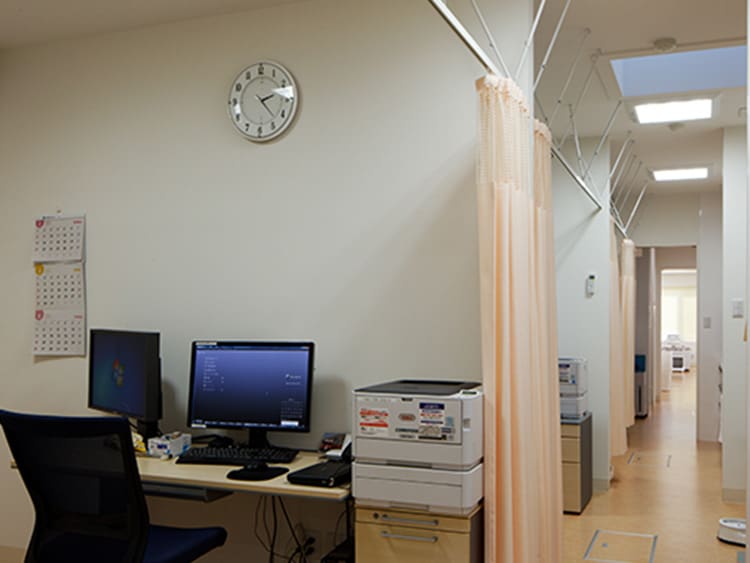 スタッフの休憩室とは別に、医師が休憩するための部屋を用意。3名の医師それぞれが休める部屋と、カンファレンスなどができる医局スペースがあります。午後の診療にそなえてしっかりリフレッシュできるよう、浴室も完備しています。